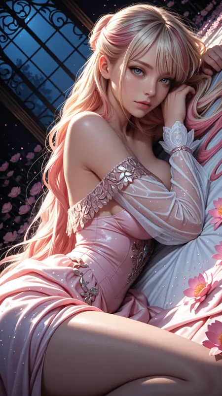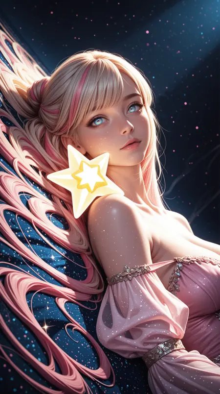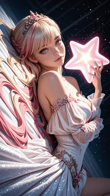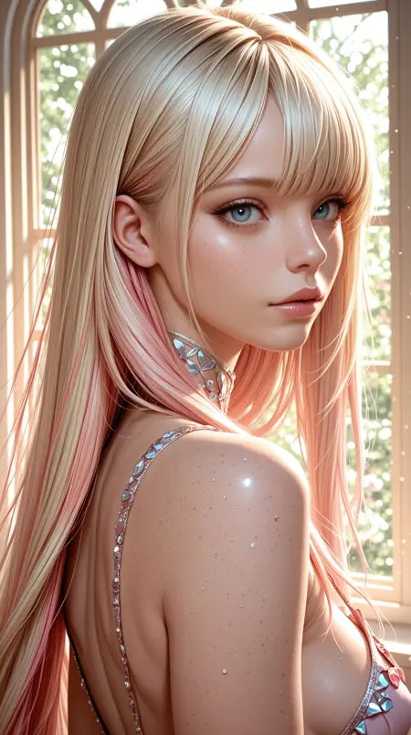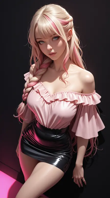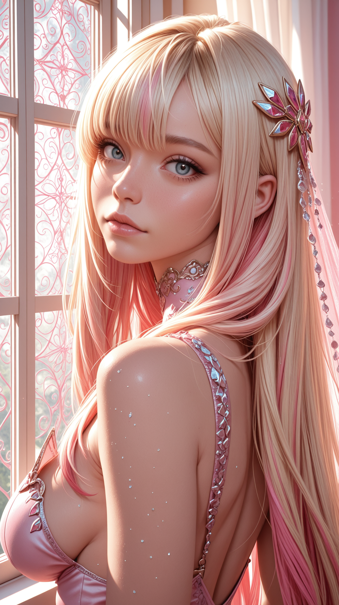 score_9, score_8_up, score_7_up, score_6_up, score_5_up, score_4_up, close up, cute, looking at viewer, woman, 22 years old, high ponytail, beauty, harmonious, face focus, a woman, blonde hair, black choker, posing, comic site, emotional, eye view, detailed, intimate, clear, personal, highly contrasted, excellent composition, advanced cinematic perfect light, highly color focused, dynamic, long hair, lush breasts, wide hips, front view, simple grey background, pastel pink detailed background, dynamic angle, lush breasts, pinup posing, dynamic angle, looking at viewer, sitting, ruffled dress, ribbons, floating hearts, selfie, smooth skin, glossy skin, and hyper-realistic with a luminous sheen, porcelain-like effect, slight gradients ,depth,glowing effect, three-dimensional feel