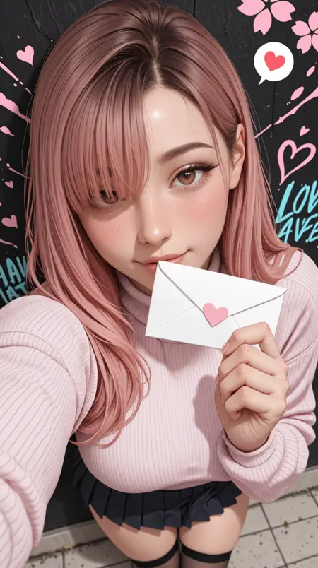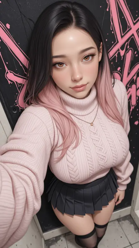 score_9, score_8_up, score_7_up, score_6_up, score_5_up, score_4_up, close up, cute, looking at viewer, woman, 22 years old, high ponytail, beauty, harmonious, face focus, a woman, blonde hair, black choker, posing, comic site, emotional, eye view, detailed, intimate, clear, personal, highly contrasted, excellent composition, advanced cinematic perfect light, highly color focused, dynamic, long hair, lush breasts, wide hips, front view, simple grey background, pastel pink detailed background, dynamic angle, lush breasts, pinup posing, dynamic angle, looking at viewer, sitting, ruffled dress, ribbons, floating hearts, selfie, smooth skin, glossy skin, and hyper-realistic with a luminous sheen, porcelain-like effect, slight gradients ,depth,glowing effect, three-dimensional feel