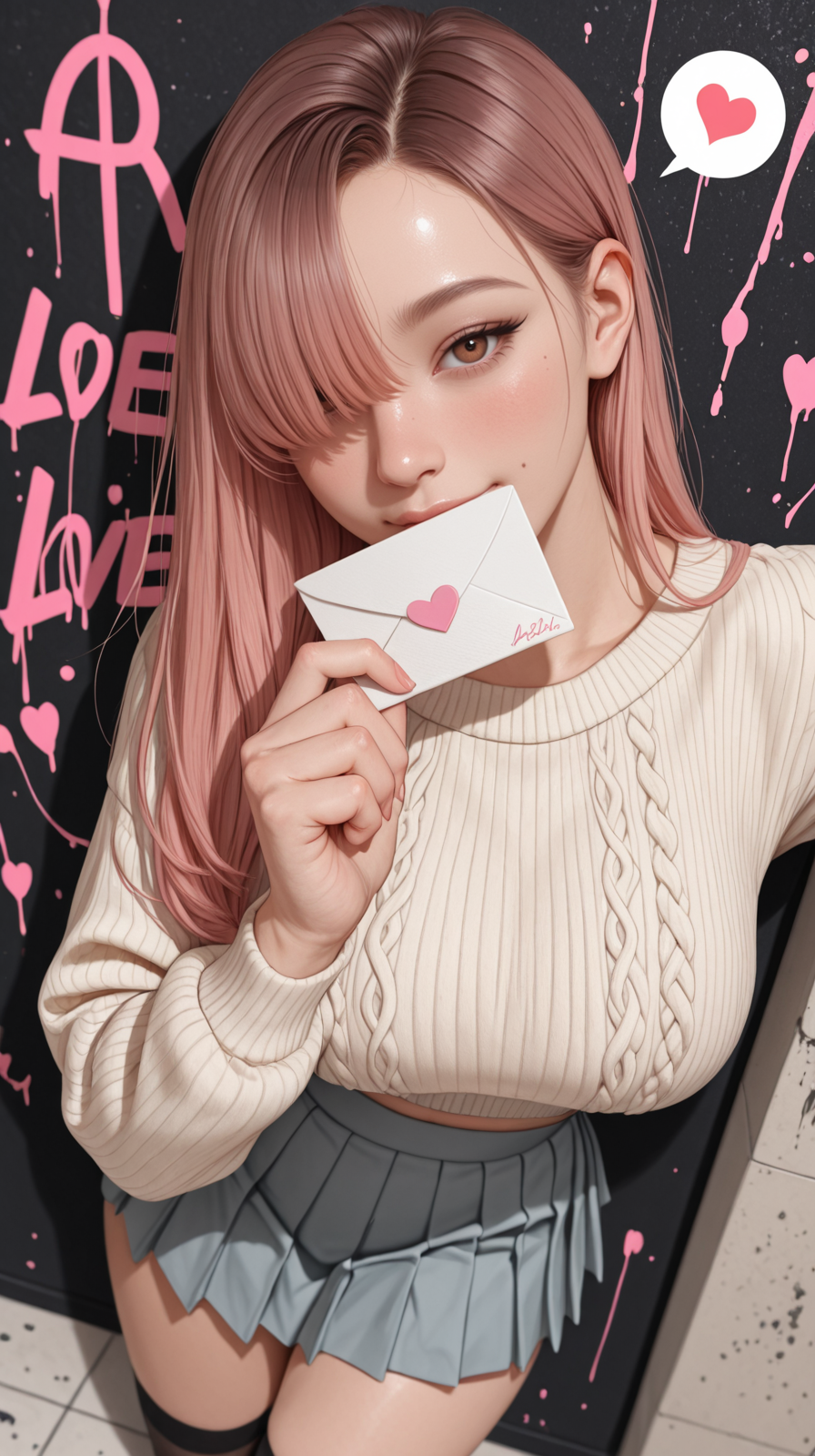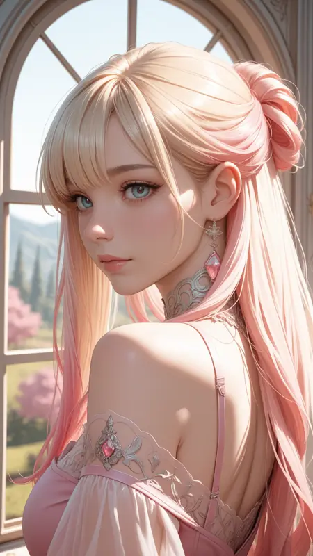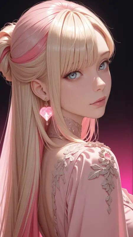 score_9, score_8_up, score_7_up, score_6_up, score_5_up, score_4_up, 特写,可爱,注视观众,女性,22岁,高马尾,美丽,和谐,面部聚焦,女性,金发,黑色项圈,摆姿势,漫画风格,情绪化,平视,细致,亲密,清晰,个人化,高对比度,优秀构图,高级电影级完美光影,高度色彩聚焦,动态,长发,丰满胸部,宽臀,正面视角,浅灰背景,淡粉色细致背景,动态角度,丰满胸部,写真姿势,动态角度,注视观众,坐着,褶皱连衣裙,丝带,漂浮的心,自拍,光滑肌肤,光泽肌肤,超现实且带发光光泽,瓷质效果,轻微渐变,深度,发光效果,三维感
