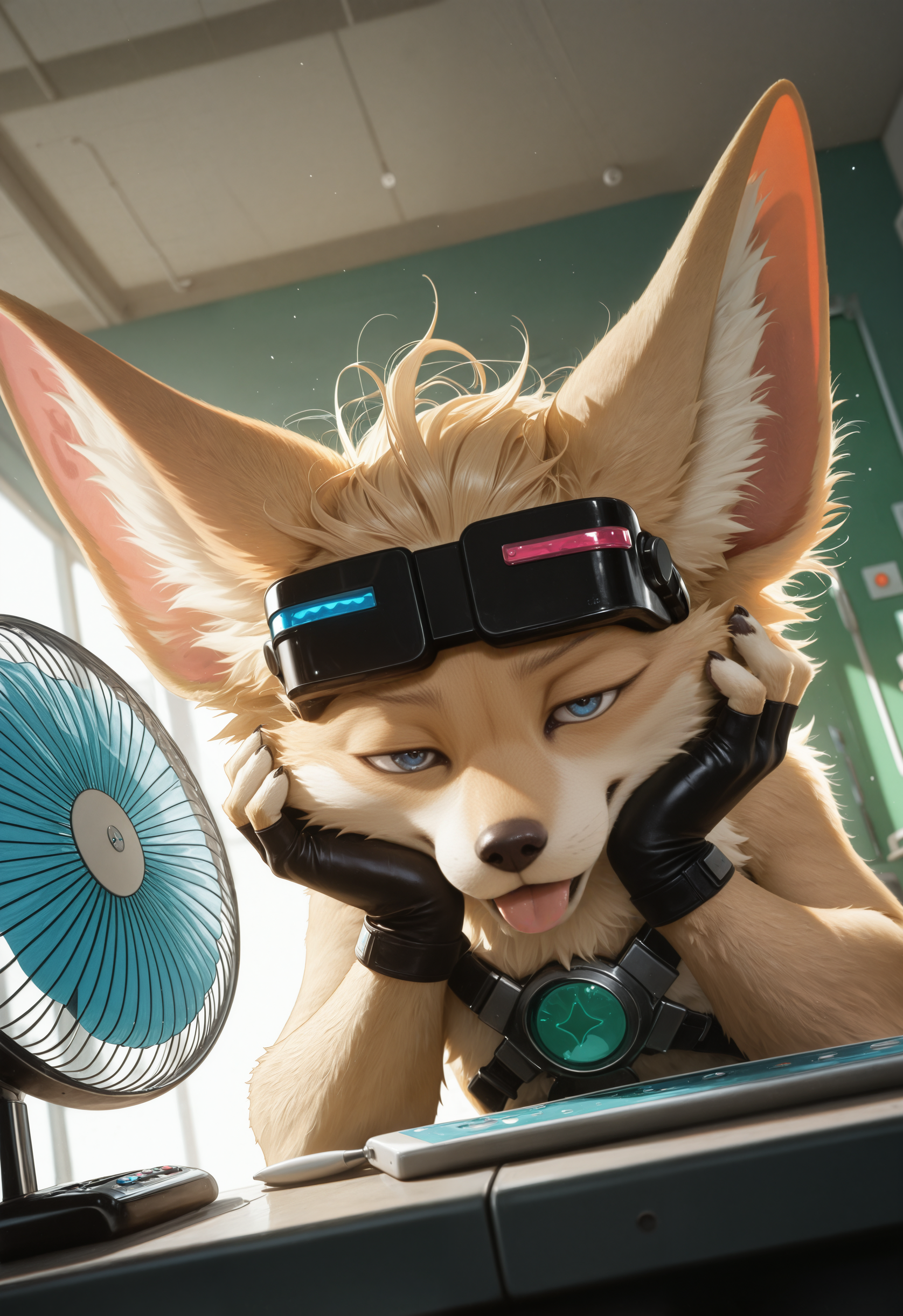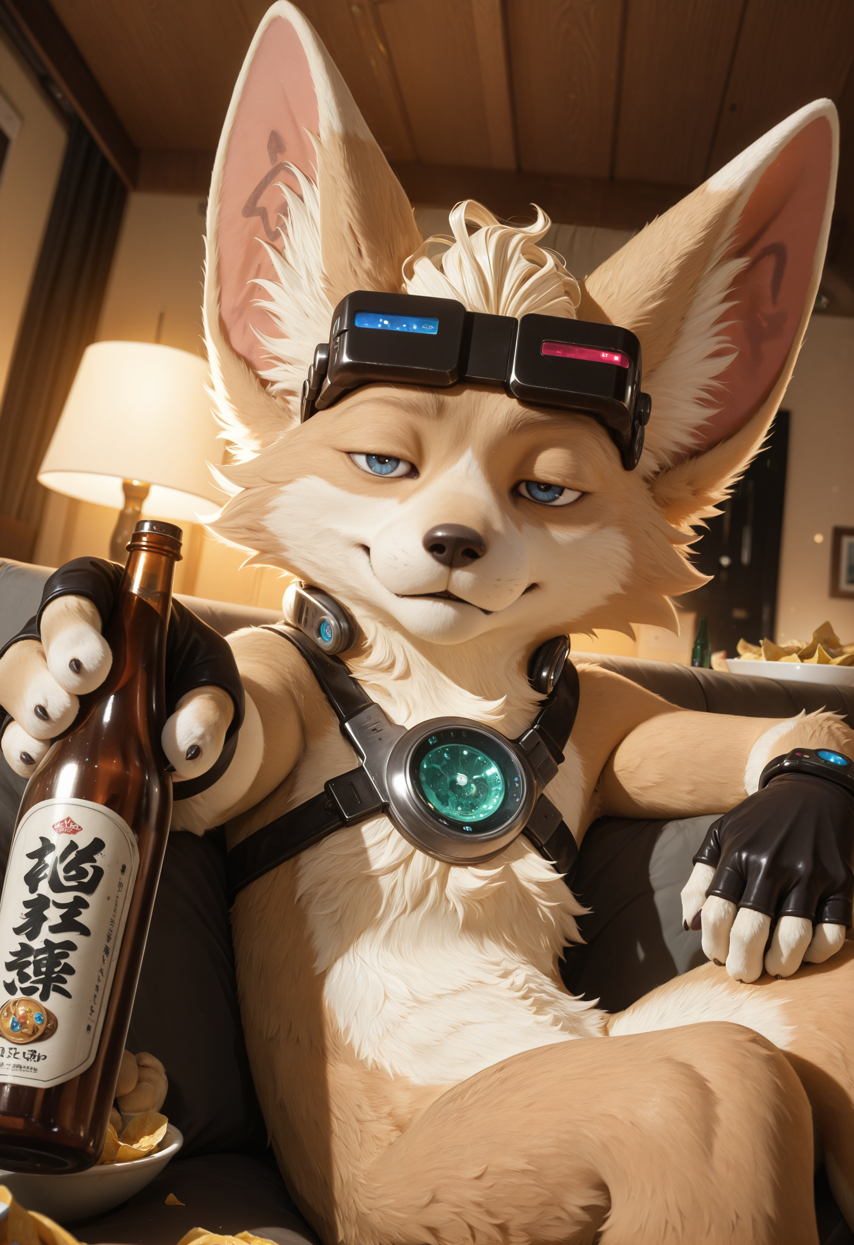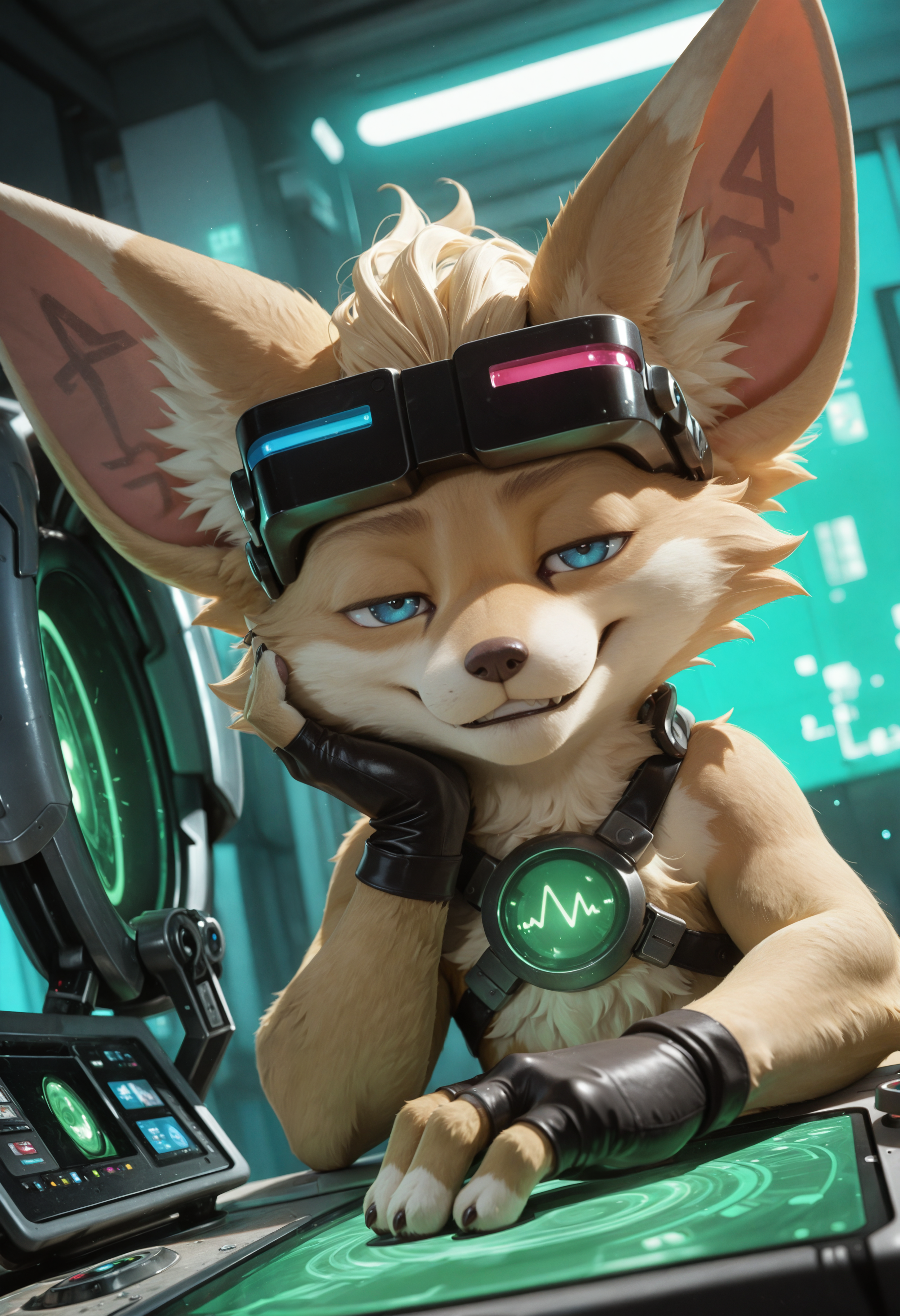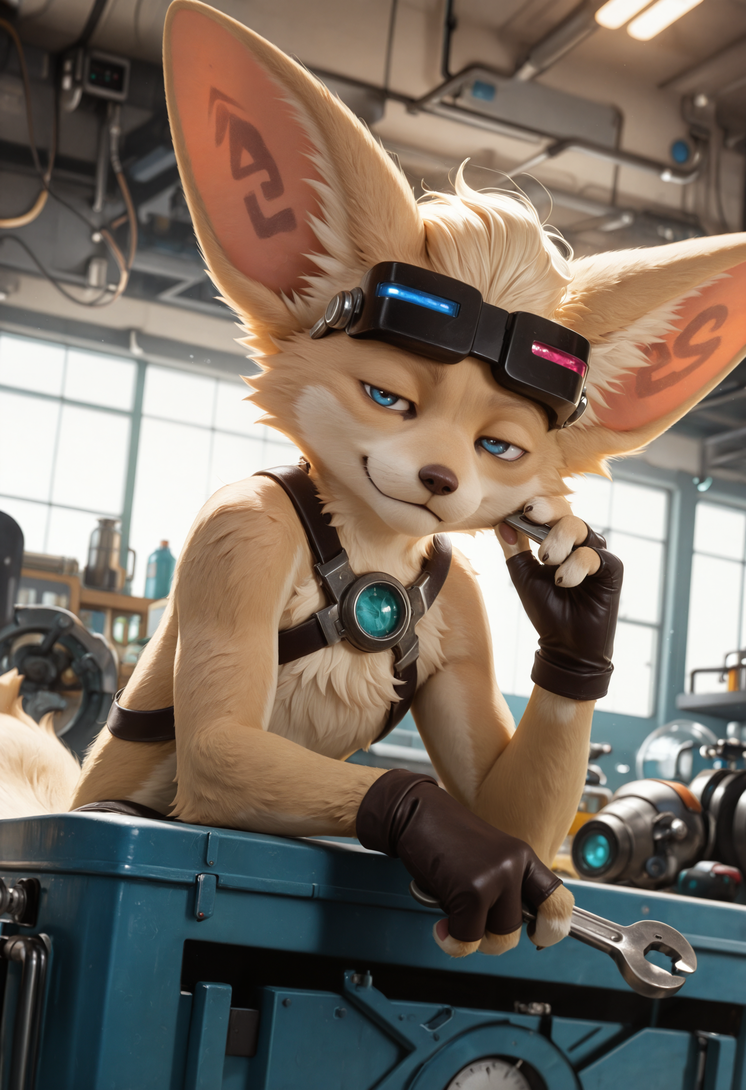 // 华丽: ch1p_mlbb, mammal, fennec fox, furry, solo, goggles, 1boy, fingerless gloves, body fur, furry male, looking at viewer
