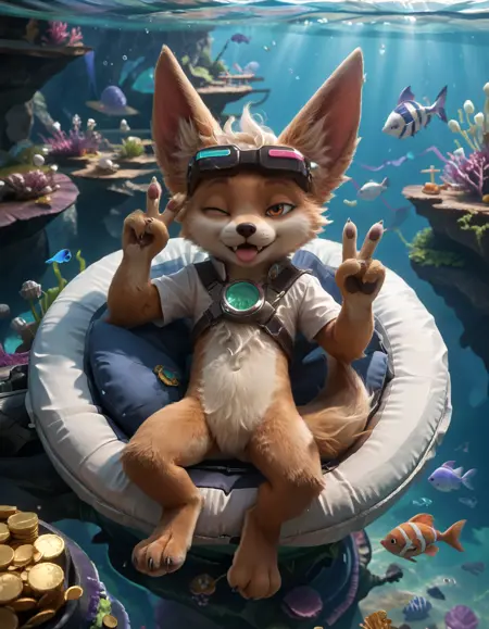 // Pony: chip the fox, fennec fox, 1boy, ocean, animal feet, tan fur, feet, goggles, body fur, fox ears, tail, 3 toes, chest tuft, cheek tuft, eyewear on head, blue eyes