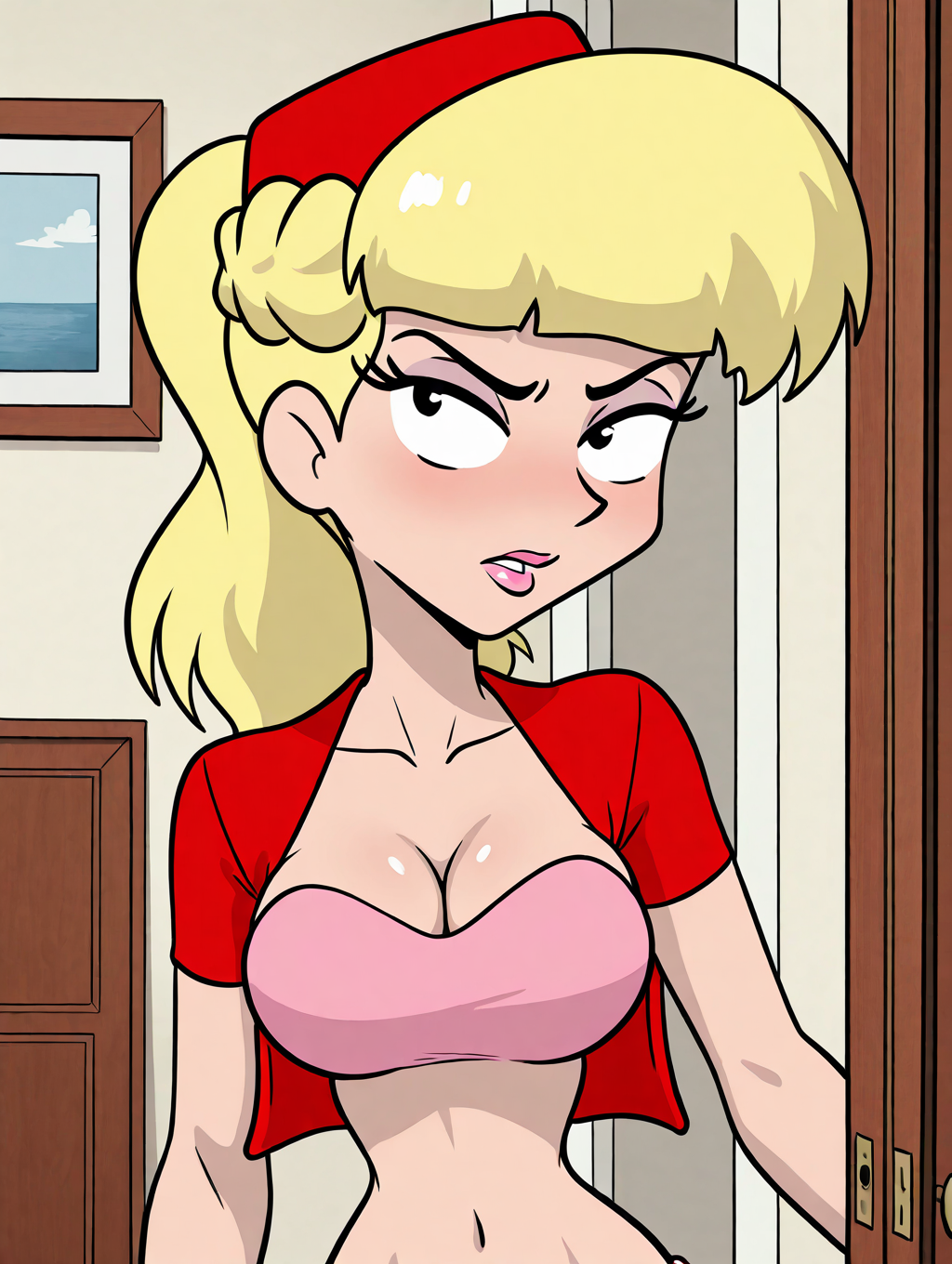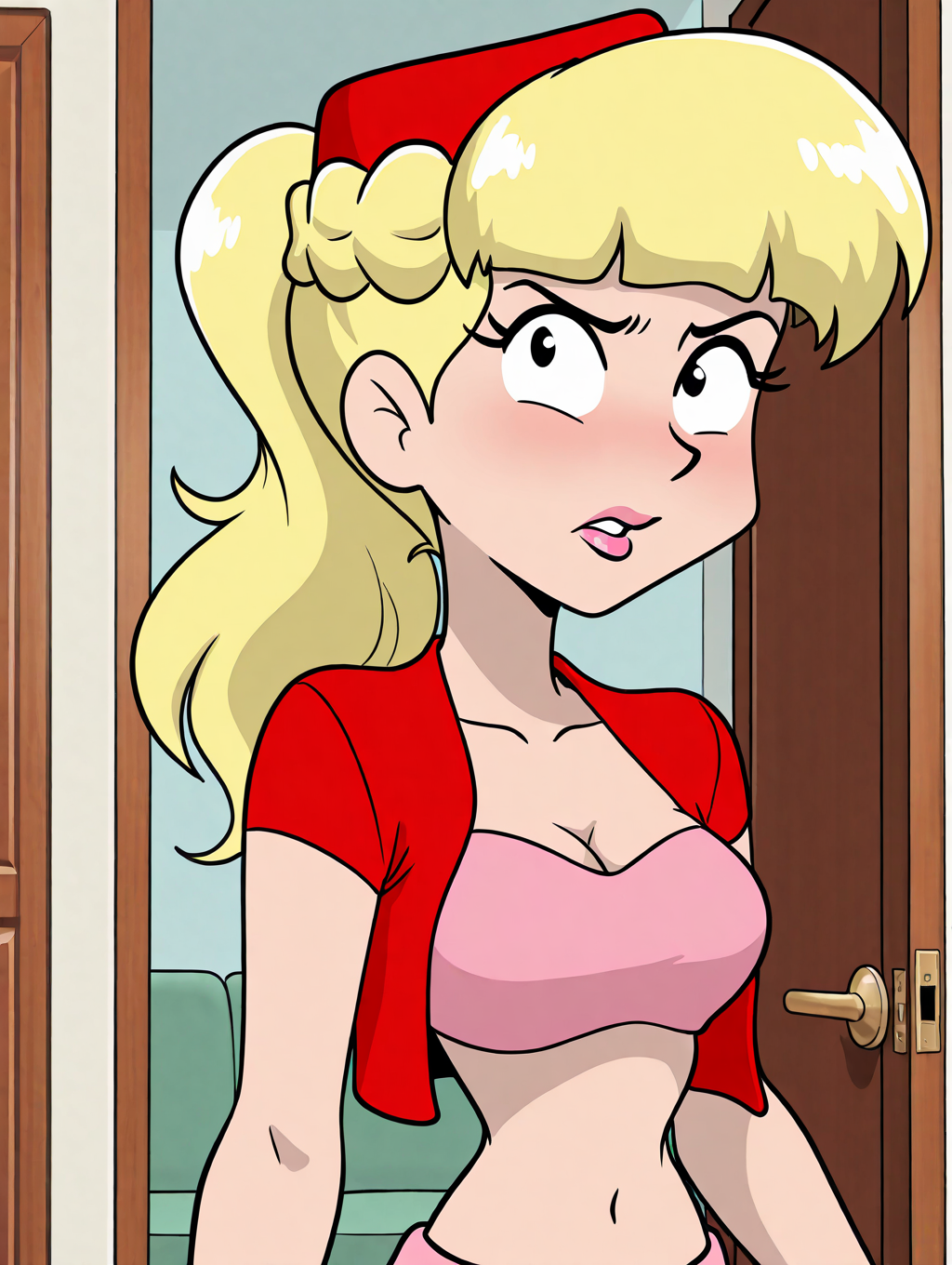 red headwear, narrow waist, red cropped jacket, pink off shoulder top, pink harem pants with red highlights, navel, midriff, pink footwear