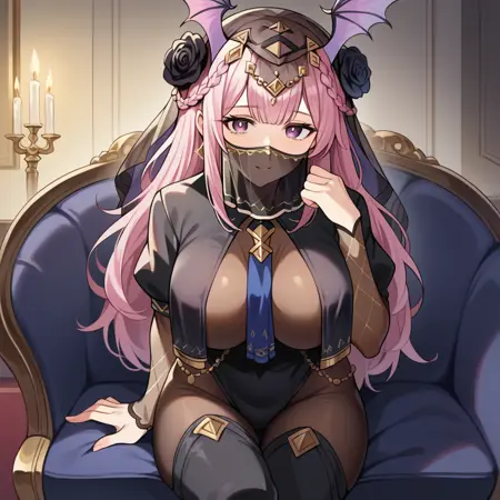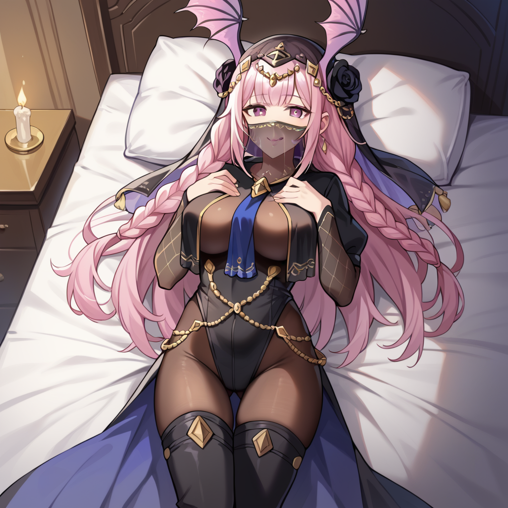 Mcore_Veil, long hair, twin braids, mouth veil, see-through, bodystocking, black leotard, breast curtains, black flower, hair flower, blue necktie, thigh boots, black footwear, black pantyhose, collarbone, collared collar, puffy short sleeves, black sleeves, see-through arm warmers, black headwear, veil, earrings, jewelry,