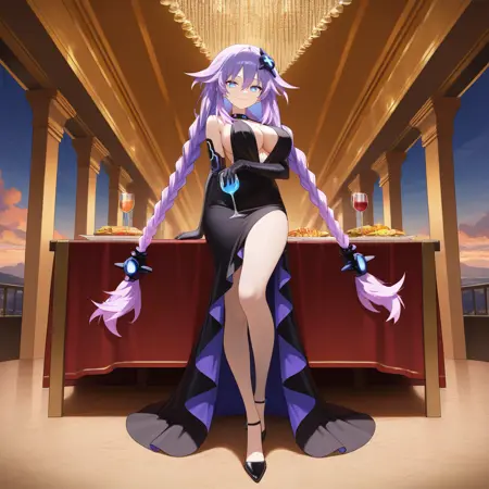 NepCpu, Fol004, Prh_Bld, 보라색 헤어, 파란 눈, 두 개의 땋은 머리, 보라색 하트, 칵테일 드레스, 검은 드레스, 가슴 노출, 옆가슴 노출, 보라색 헤어 장식, 팔꿈치 장갑, 검은 장갑, 검은 하이힐,