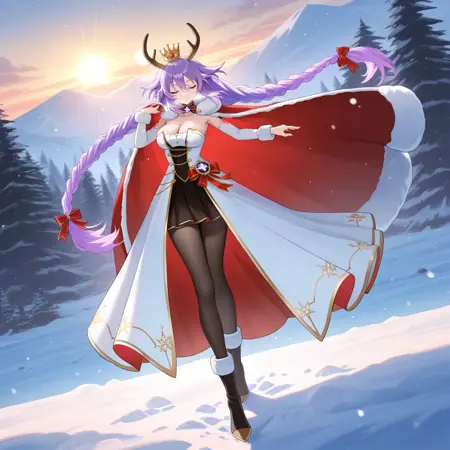 NepCpu, Fol003, Prh_Chr, 보라색 헤어, 파란 눈, 두 개의 땋은 머리, 보라색 하트, 털 장식 드레스, 털 장식 부츠, 빨간 신발, 산타 모자, 빨간 머리장식, 털 장식 카펠렛, 빨간 카펠렛, 부풀어 오른 분리형 소매, 빨간 소매, 털 장식 소매, 짧은 드레스, 털 장식 벨트, 털 칼라, 흰색 헤어 장식, 뽀로로(옷),