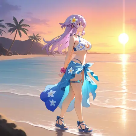 NepNep, Fol001, Np_Swm, 紫发, 紫眼, Neptune(Neptune系列), 褶边比基尼, 橙色比基尼, 比基尼裙, 白色丝带, 珠串手链, 手链, 花朵发饰, 红花, 橙色人字拖,