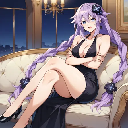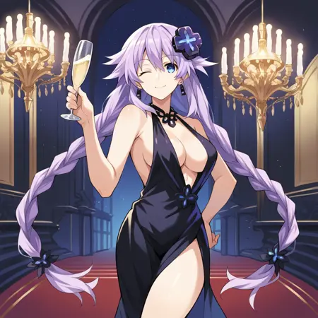 NepCpu, Fol004, Prh_Bld, 紫发, 蓝眼, 双辫, 紫心, 鸡尾酒裙, 黑色连衣裙, 胸部露肤, 侧露乳沟, 紫色发饰, 肘部手套, 黑色手套, 黑色高跟鞋,
