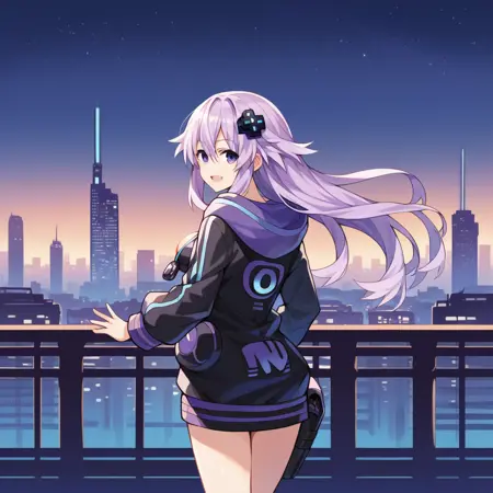 NepNep, Fol002, Np_Ivs, 紫发, 紫眼, Neptune(Neptune系列), D-pad发饰, 黑色水手领, 白色内衣, 中央开衩, 悬挂带, 多条腰带, 黑色腰带, 无袖背心, 开襟背心, 交叉背带, 黑色分离式袖子, Juliet袖子, 黑色手套, 无指手套, 格子裙, 紫色裙子, 多条大腿绑带, 棕色过膝袜, 裸露肩膀,
