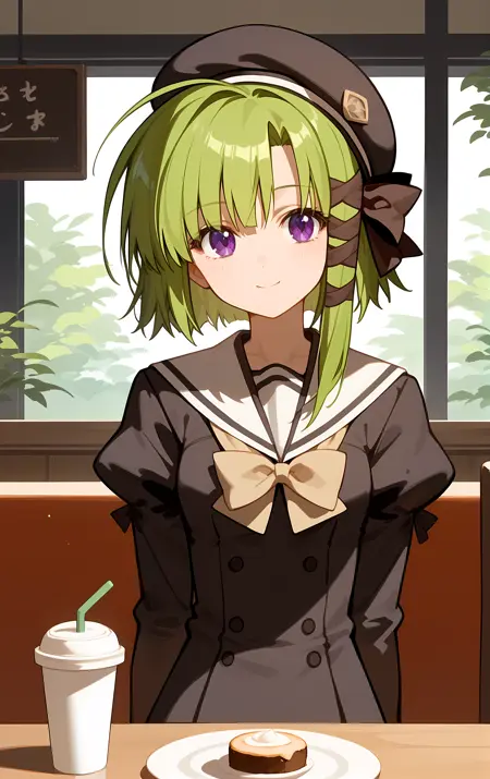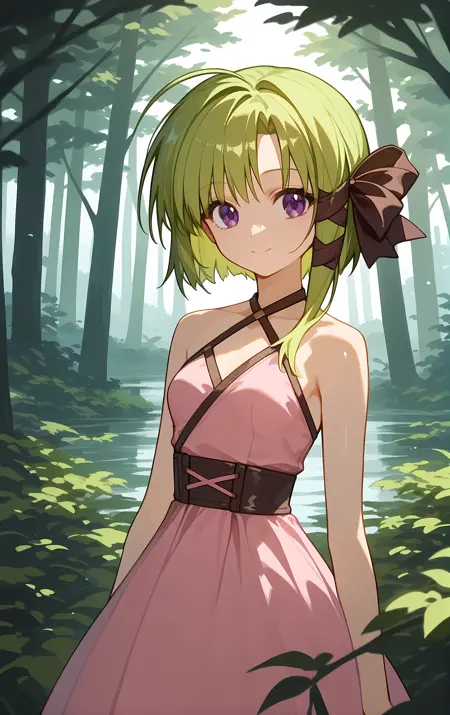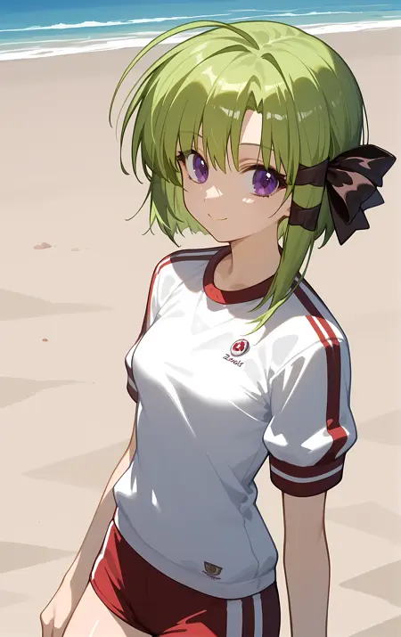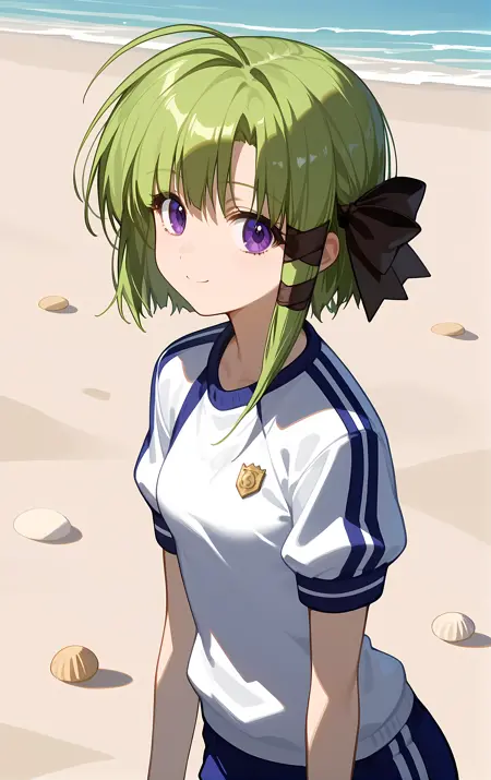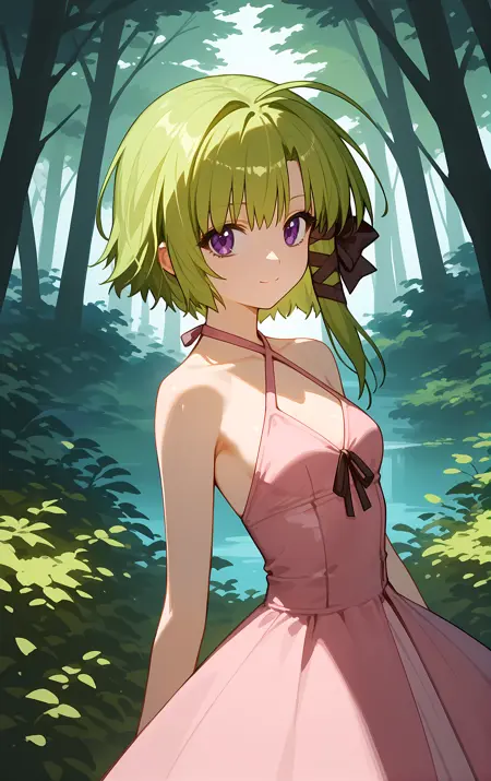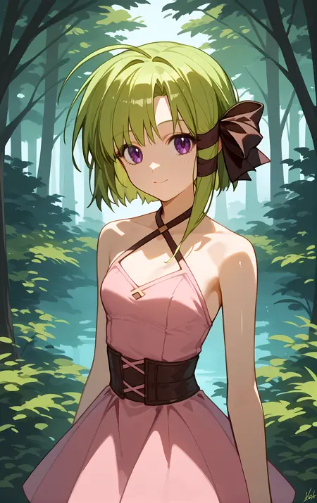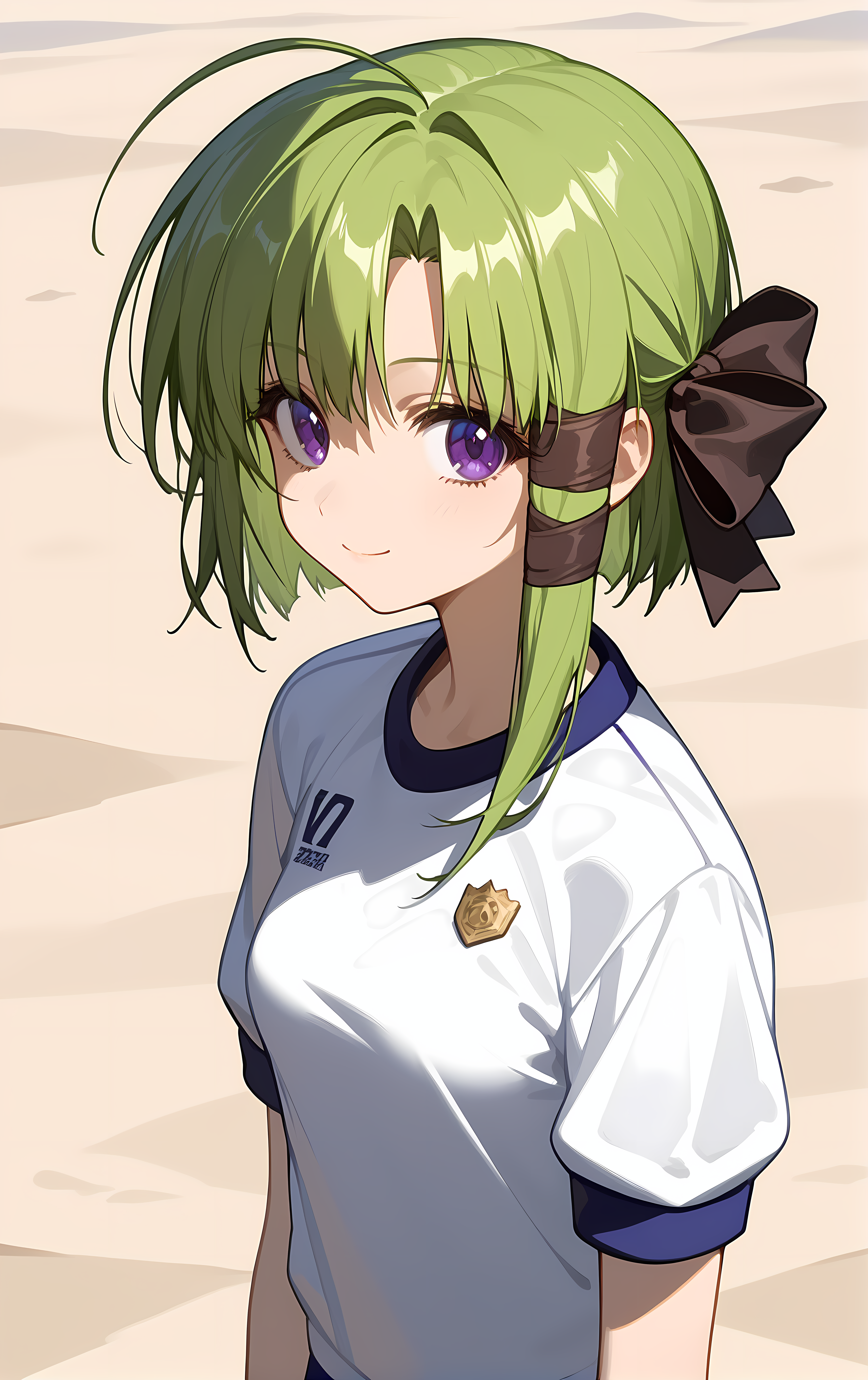 外見 → ohwx, 1girl, solo, green_hair, short_hair, purple_eyes, hair_ribbon, ribbon, short_hair_with_long_locks, tress_ribbon, bow, ahoge, small_breasts, very_long_hair, asymmetrical_hair, long_hair,