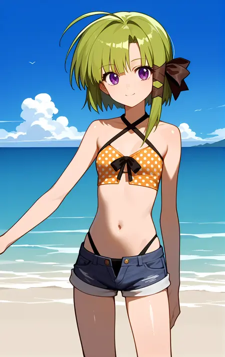 衣装5 → shorts, navel, short_shorts, denim_shorts, cutoffs, bikini, swimsuit, midriff, bare_shoulders, denim, crop_top, tankini, polka_dot,