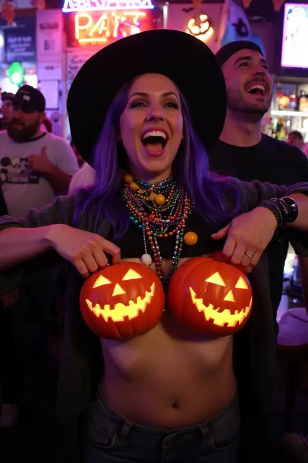 推奨タグ:lifting her shirt to reveal her breasts, at a mardi gras parade, colorful beads, a night photograph taken indoors, smiling with an open mouth and excitement