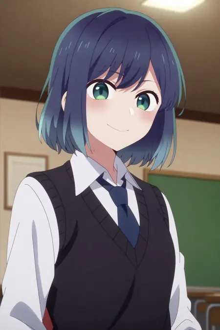 トリガー:akane kurokawa,1girl,solo,short hair,white shirt,green eyes,bangs,school uniform,collared shirt,sweater vest,necktie,blue necktie,symbol-shaped pupils,star (symbol)