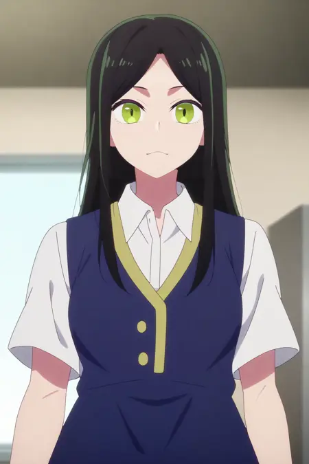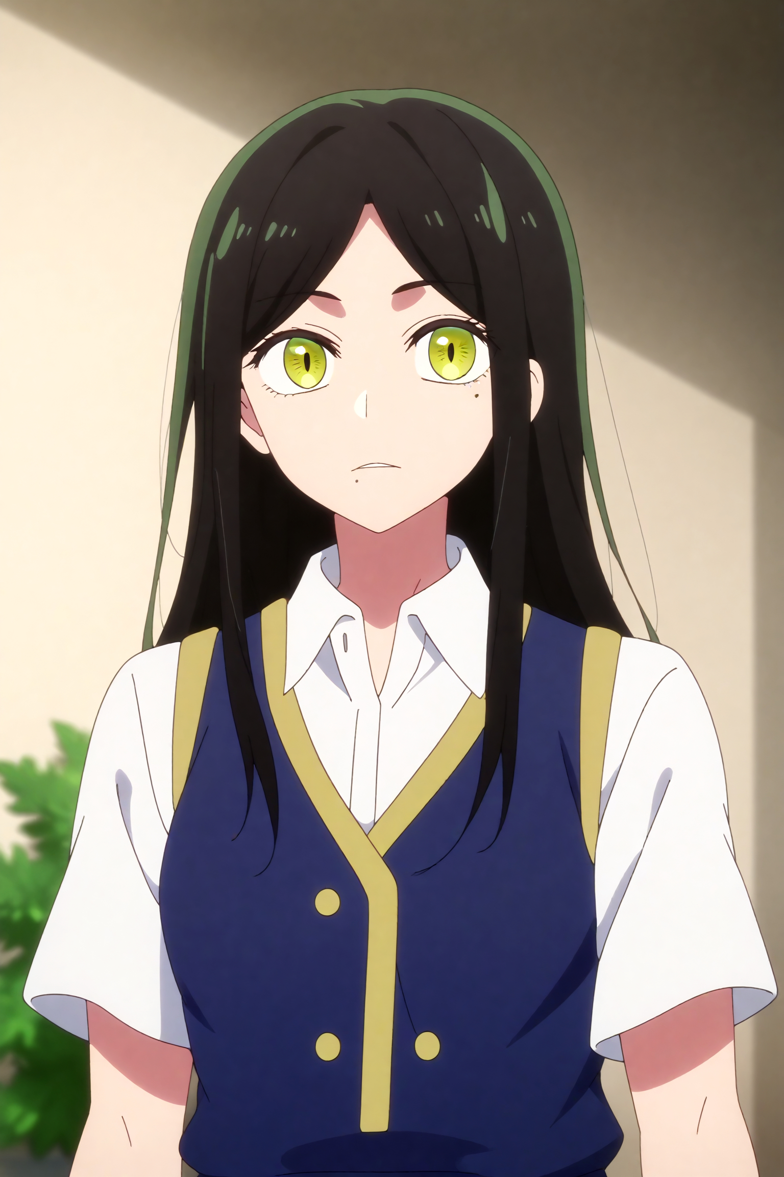 트리거: 프릴 시라누이, 1소녀, 단독, 검은 머리, 가슴, 다색 머리, 긴 머리, 셔츠, 흰 셔츠, 녹색 머리, (점), 눈 밑 점, 입 밑 점, 칼라 셔츠, 흰 셔츠