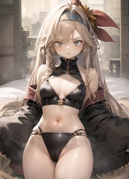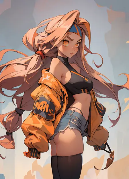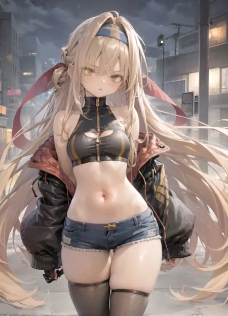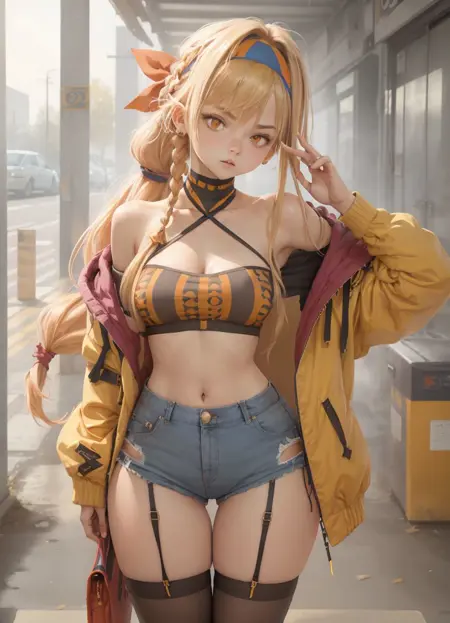 侧分辫,发带,发饰,(高腰短裤,高腰,短裤,过膝袜:1.2),露肩夹克,宽松外套,露肩,背心,红丝带,发饰带,膨胀袖口