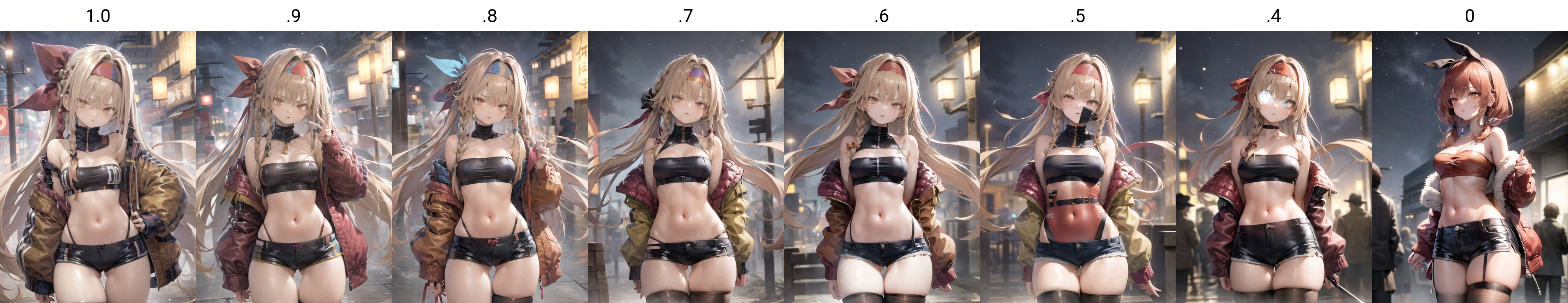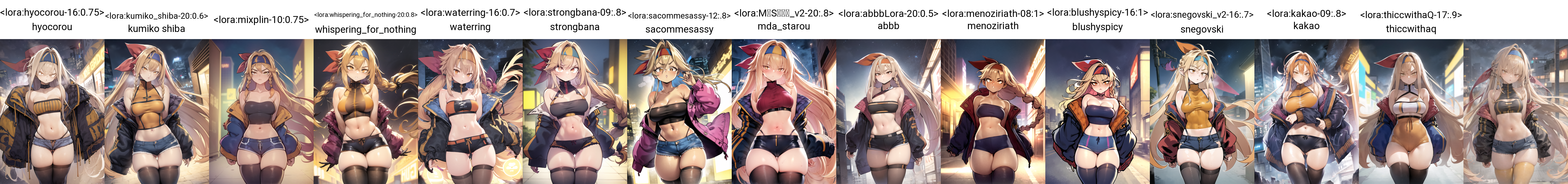 由于该角色为Hyocorou原创,无同人美术基础,因此该LoRA也会影响整体画风。若需与其他画风结合使用,建议使用约0.85的权重(已附带多个示例)。当权重低于0.6时,图像已几乎无法辨认(可见XYZ对比图)。