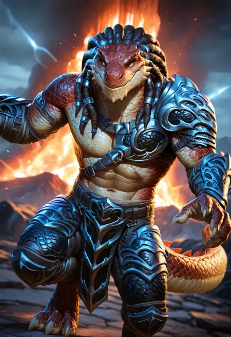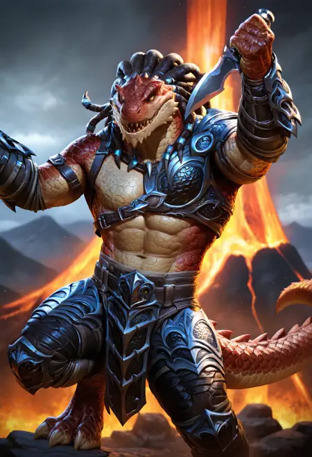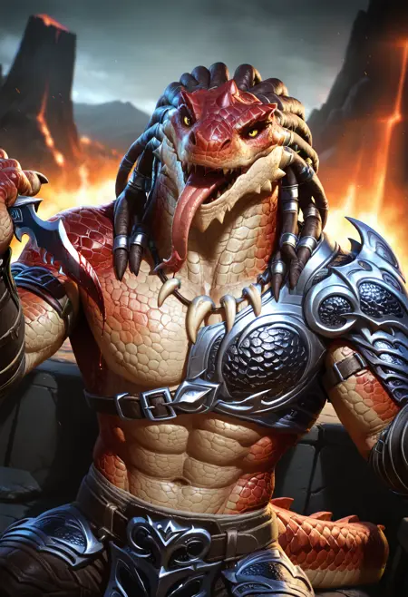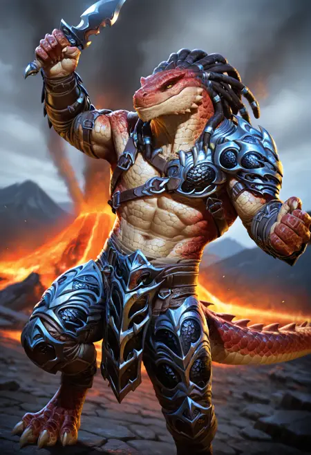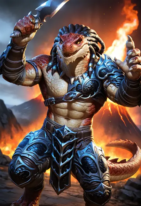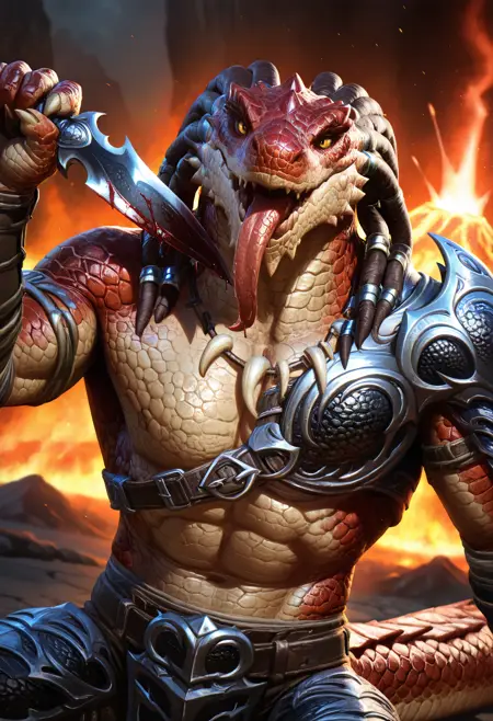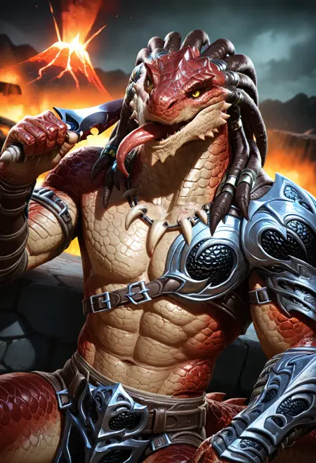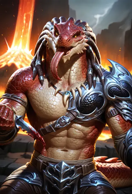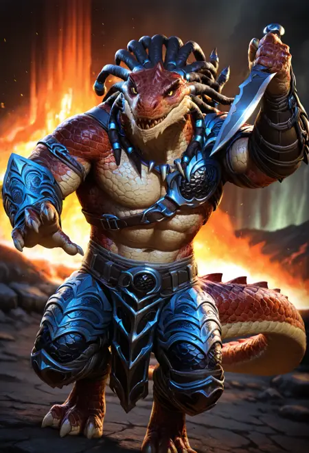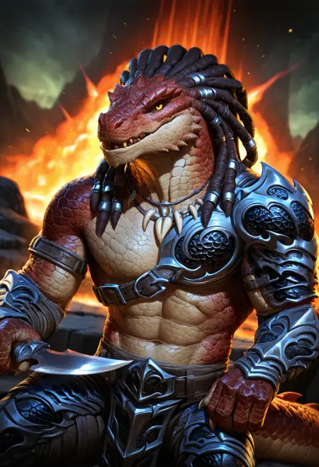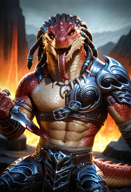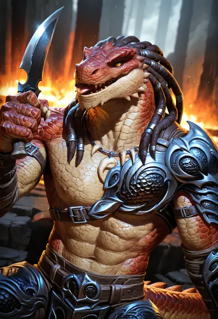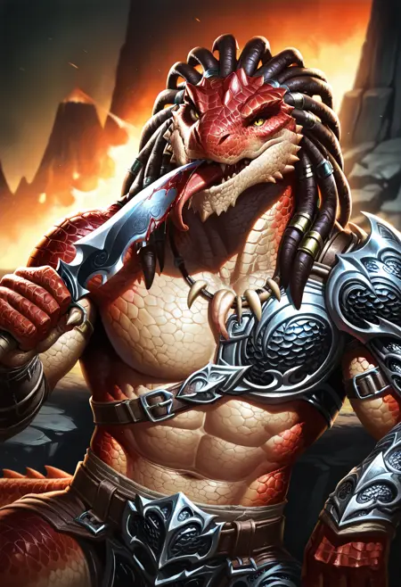 // Illustrious: salazar_wor, scales, armor, holding, weapon, holding weapon, furry, furry male, abs, necklace, dagger, claws, yellow eyes, muscular, dreadlocks, belt, harness