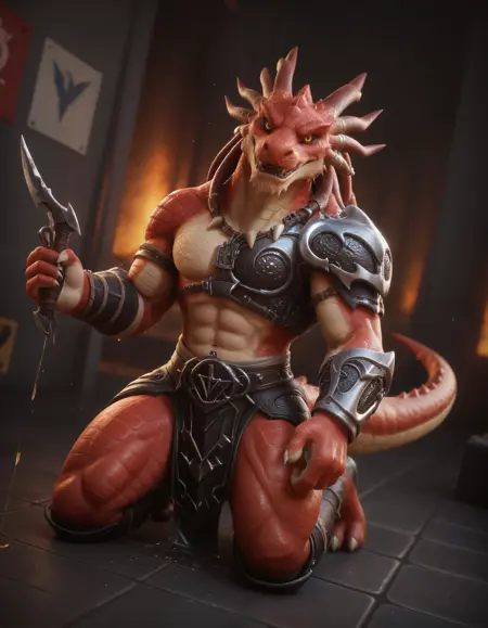 // Pony: anthro, furry, dragon tail, holding, armor, holding weapon, furry male, fangs, muscular, sharp teeth, yellow eyes