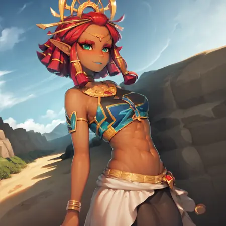Activation Token is Riju and if you want to get her default outfit you can use tags like crop top, skirt, bracelets. Her lipstick is kind of weird though and always present maybe you want to put "lipstick" in negatives or just prompt it, it works most of the time.