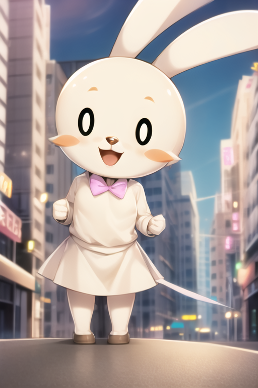 Use tsidoki at the start of the prompt to summon her (no 1girl, no chibi), use white eyes, rabbit ears, body fur to form her head, use pink bowtie, white shirt, white skirt to summon her clothings