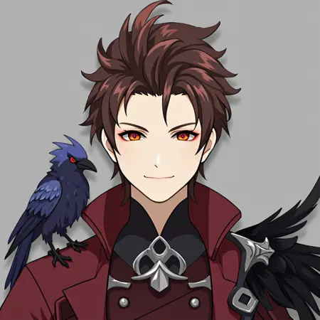 genshinportrait, 짧고 흐트러진 검은 머리에 어두운 파란색 끝이 점점 진해지고 사각형 안경을 쓴 남성. 그는 진한 자주색 옷을 입고 있으며, 검정색과 회색의 디테일이 있으며, 어깨 위에는 작고 청록색을 띤 까마귀가 앉아 있다. 반대쪽 어깨에는 검은 깃털로 된 갑옷 판이 있다. 그의 눈은 진한 붉은색이다. <lora:flux_genshinportraits_000002400:1>
