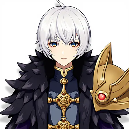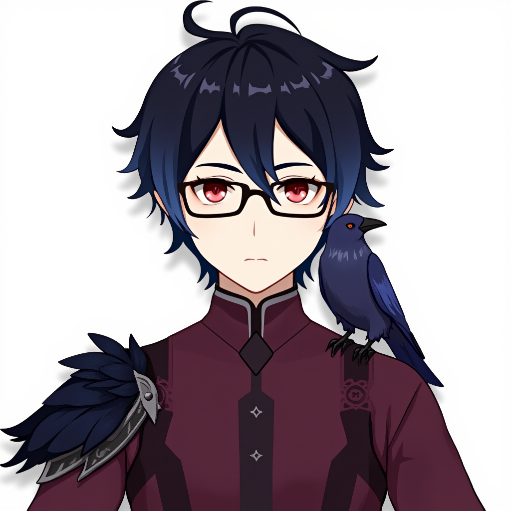 genshinportrait, A male with short tussled black hair which gradients into dark blue tips and a pair of square spectacles. He has a deep maroon outfit withblack and grey detailing and a small, blueish-black crow perched on his shoulder. On the opposite shoulder is a black feathered armor plate. He has deep red eyes. <lora:flux_genshinportraits_000002400:1>