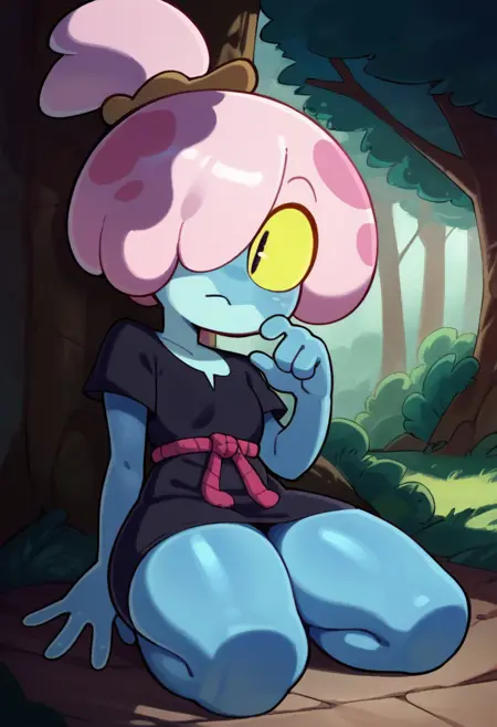 Trigger words: m4ddi3fl0ur, frog girl, pink hair, hair over one eye, topknot, slit pupils, yellow sclera, blue skin with light blue chest, frog tail