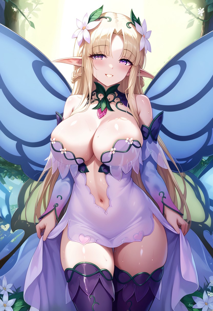 mgetitania,blonde hair,hair ornament,purple eyes,dress,detached sleeves,bare shoulders,jewel,thighhighs,fairy wings,large breasts