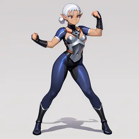 オプション:赤い目、とがった耳、暗い肌、白い髪、短い髪、目のマーク、青いボディスーツ、胸当て