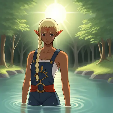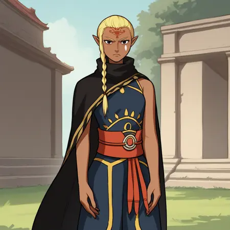 dark skin, blonde hair, braid, pointy ears, forehead mark, bare shoulders, dark blue outfit, sash