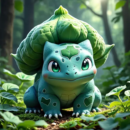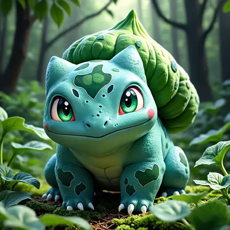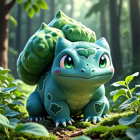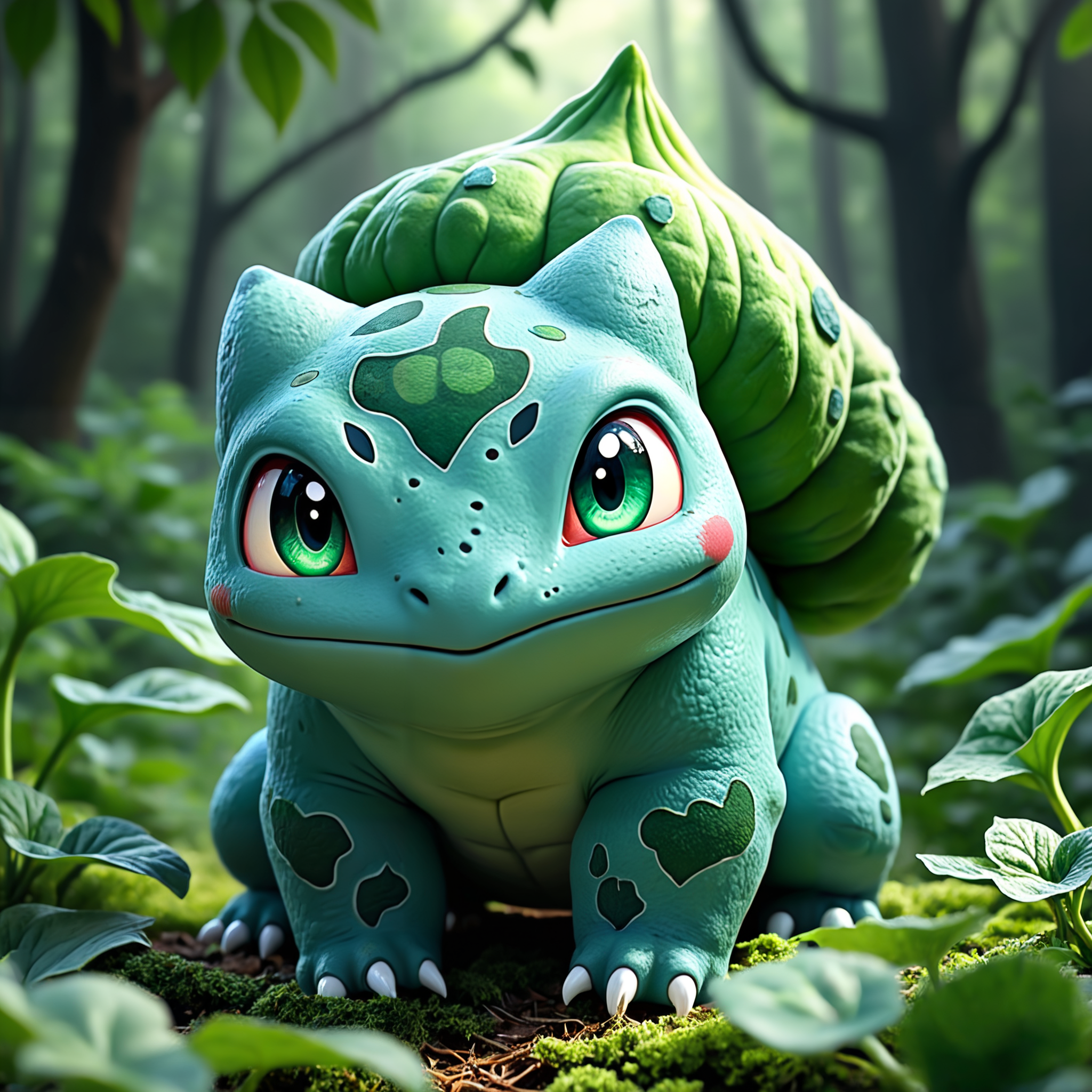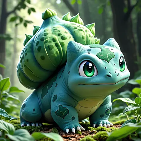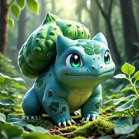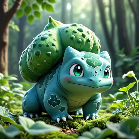 The setting enhances Bulbasaur's connection to the natural world, with a lush forest or sunlit meadow surrounding the creature. The realistic lighting makes it appear as if Bulbasaur is truly part of this vibrant, living environment. The atmosphere evokes a sense of peace and power, underscoring Bulbasaur’s role as a serene yet formidable being in nature.