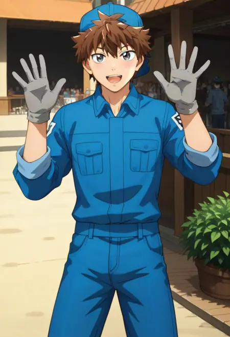 blue backwards cap, plain blue uniform, plain blue pants, rolled sleeves, grey gloves