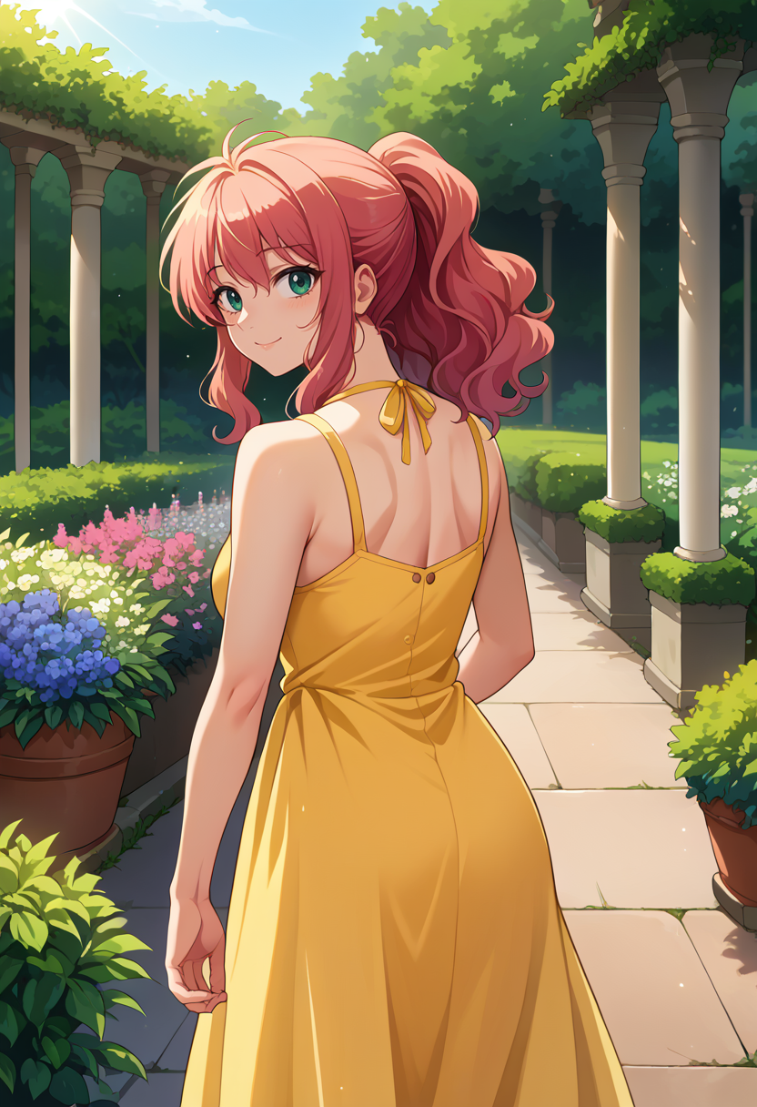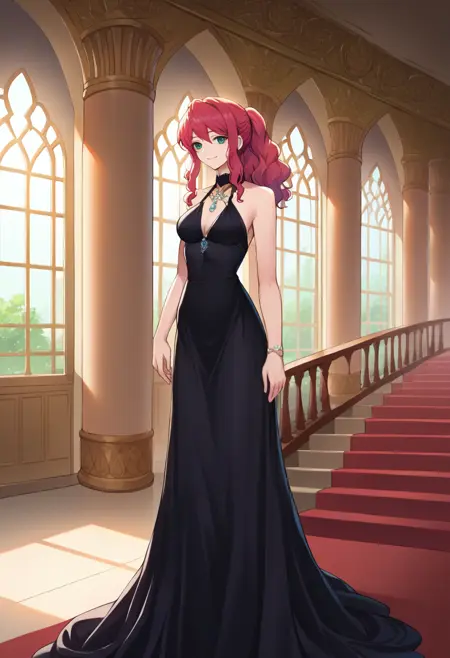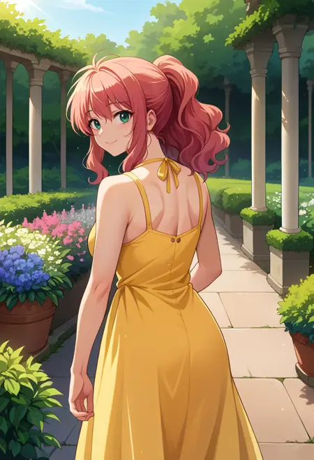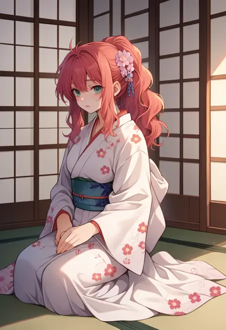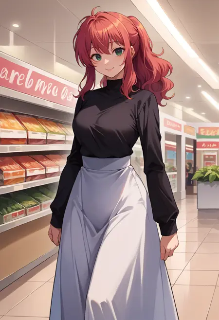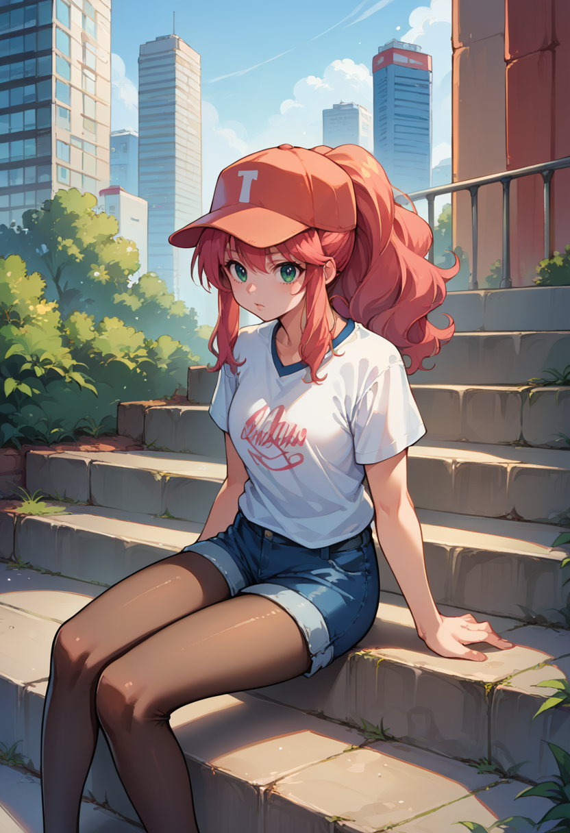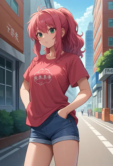 FeldtDefault, long hair, ponytail, multicolored shirt, white shirt, green shirt, pink jacket, cropped jacket, white gloves, belt, white pants