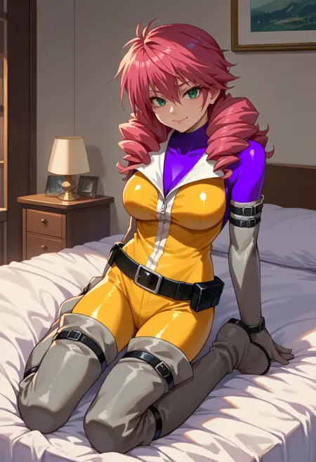 FeldtBodysuit, long hair, twin drills, purple bodystocking, yellow bodysuit, grey elbow gloves, black belt, grey thigh boots