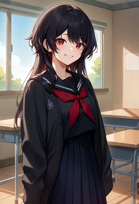 RenSchool, black hair, long hair, black serafuku, red neckerchief, black skirt, black cardigan