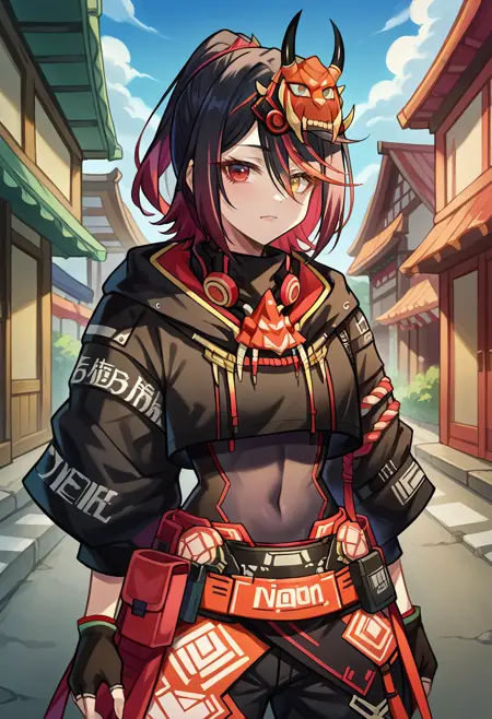 RenSamurai, heterochromia, multicolored hair, long hair, high ponytail, oni mask, mask on head, gas mask around neck, black hoodie, cropped hoodie, covered navel, black gloves, fingerless gloves, red waist cape, black pants, baggy pants, knee pads