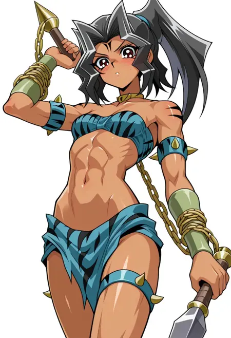 prompt: yu gi oh, chain, breasts, dark-skinned female, dark skin, long hair, ponytail, brown eyes, large breasts, muscular, muscular female, abs, thighs, amazonesse chain master, thigh strap, Amazoness Trainee, Black hair