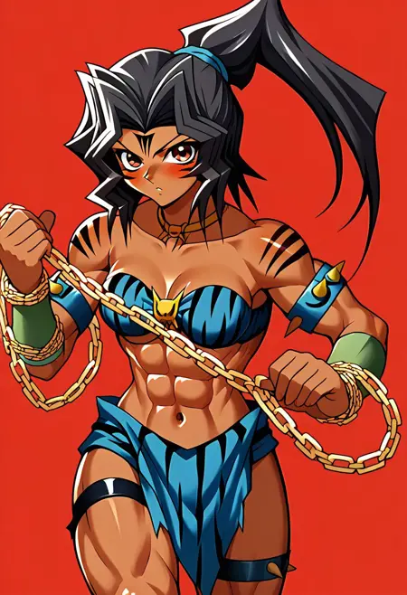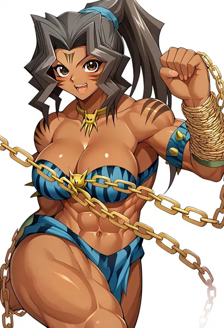 prompt: yu gi oh, chain, breasts, dark-skinned female, dark skin, long hair, ponytail, brown eyes, large breasts, muscular, muscular female, abs, thighs, amazonesse chain master, thigh strap, Amazoness Trainee, Black hair