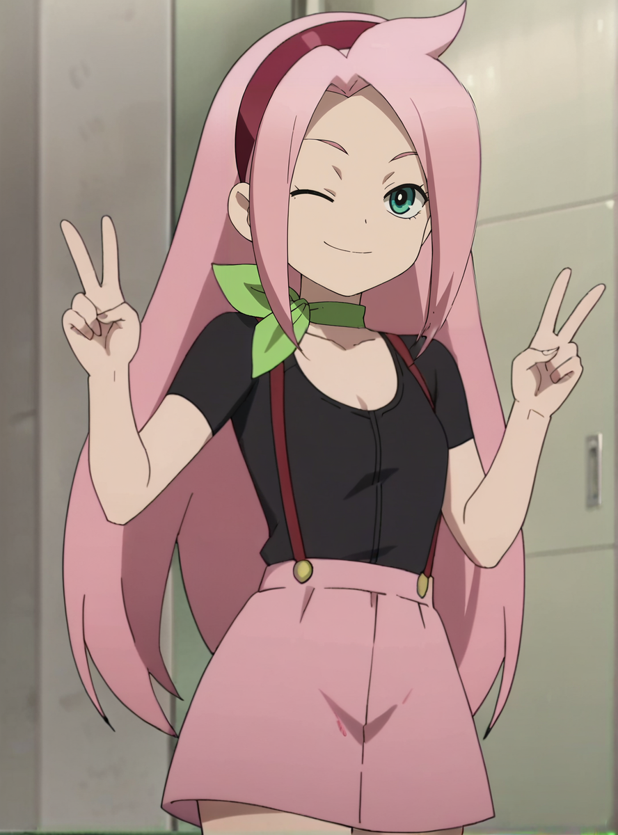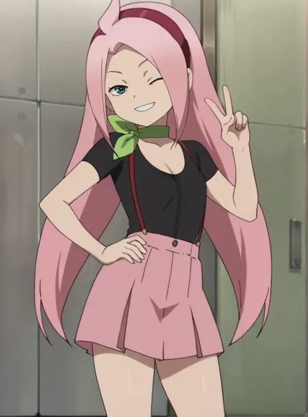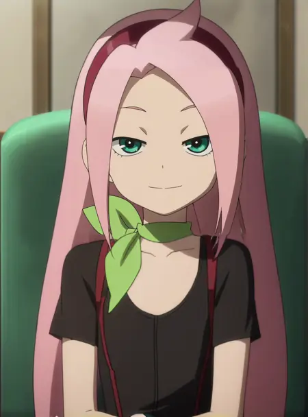 提示:粉发,1个女孩,长发,单人,动漫上色,发带,绿眼,微笑,围巾,项圈,黑色上衣,粉色裙子,微笑,