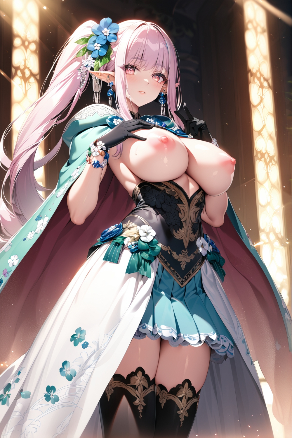 celestelavielt, 精灵, 尖耳朵, 侧边马尾, 侧发, 头发花朵, 极长发, 粉色头发, 白色头发, 红色眼睛, 双面斗篷, 花纹图案, 饰品, 耳环, 斗篷, 外裙,