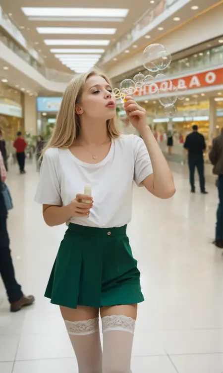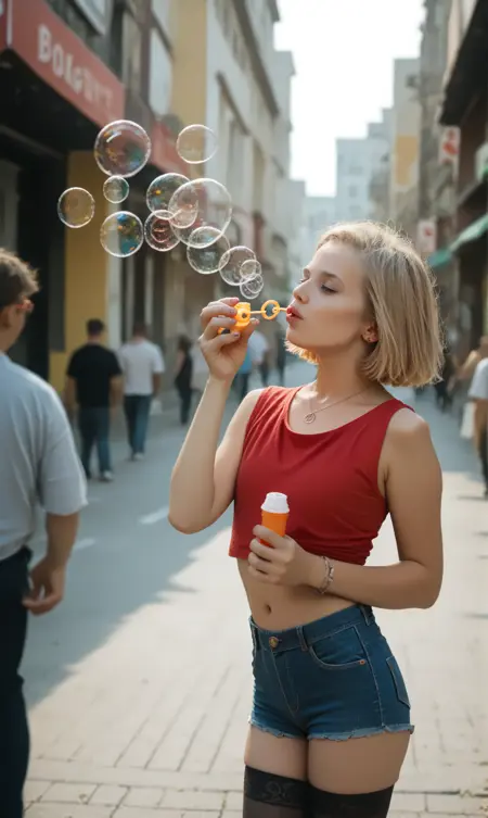 score_9, score_8_up, score_7_up, blobub, スリムな25歳の女の子が気泡を吹きながら公園に立っている。長い金色のポニーテール。