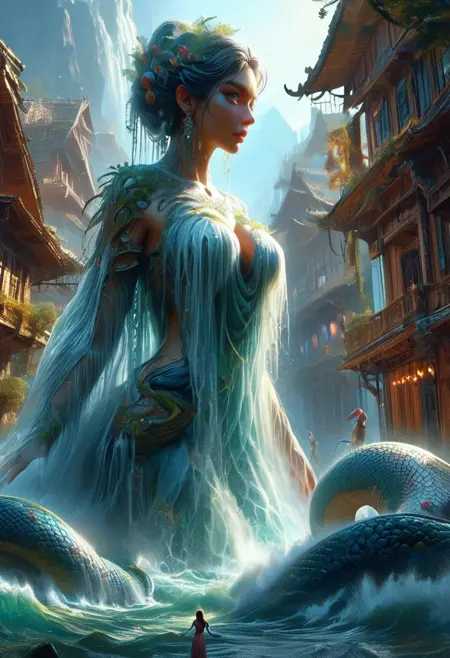 SDXL 모델은 물과 파도로 이루어진 드레스를 입은 물 신의 이미지를 생성합니다. 또한 신이 "물 마법", "물 주문" 또는 물 조작을 수행하는 장면도 생성할 수 있습니다. 일반적으로 저는 강도를 0.6-1.0으로 사용하지만, 다양한 설정을 시도해보세요. 트리거 단어는 "watergoddess"이며, 프롬프트에 "water magic"을 추가하면 더욱 재미있는 결과를 얻을 수 있습니다. 손과 얼굴 생성에 일부 문제를 겪었지만, 여전히 매우 재미있는 이미지를 얻을 수 있습니다.