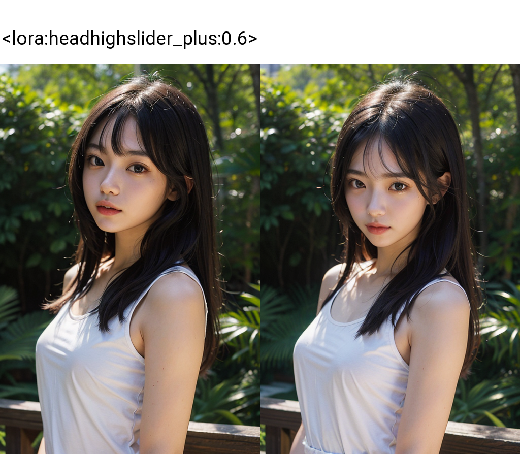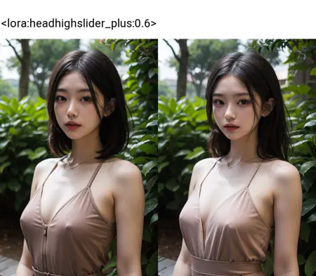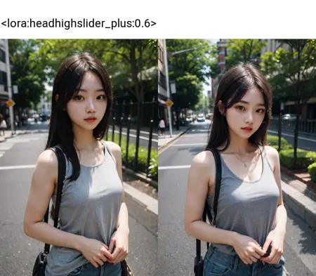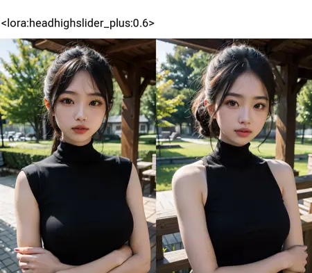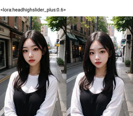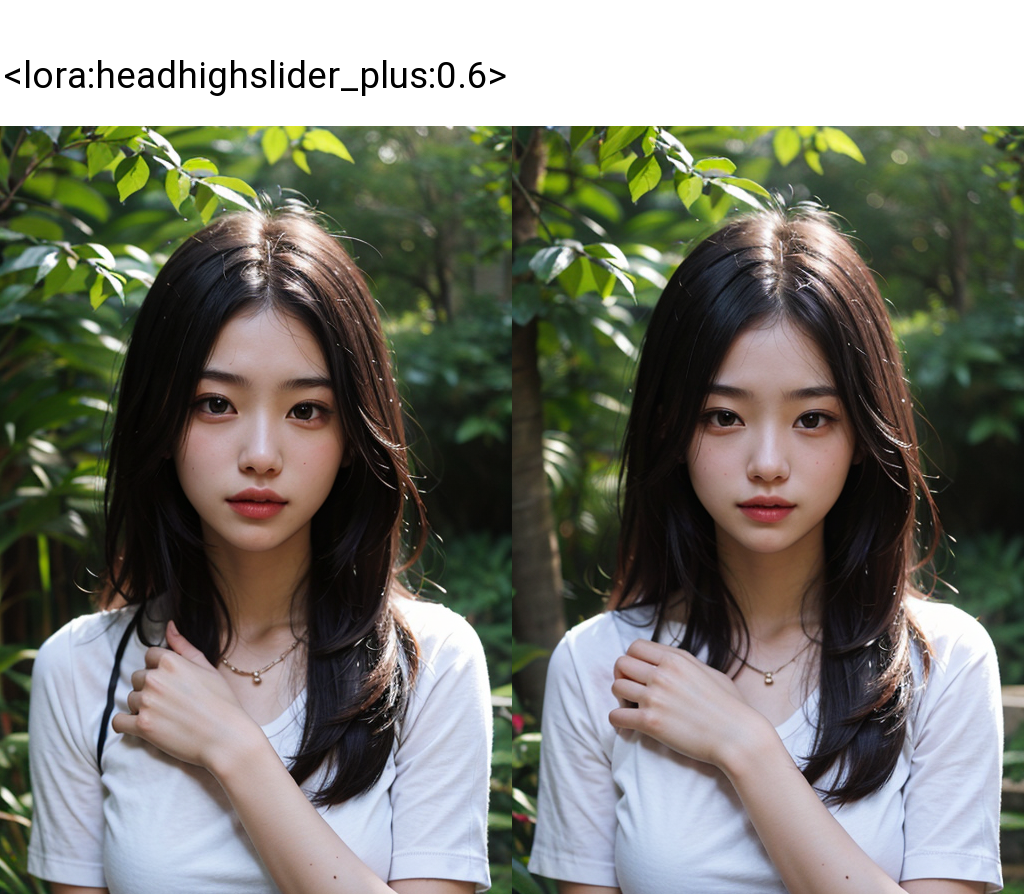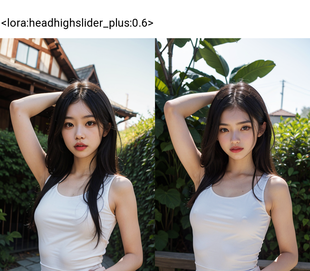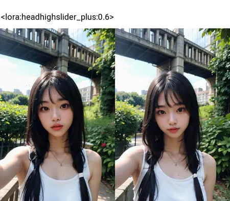Note: If you often use pony or sdxl asian models, you may also be tired of the frequent head down of SD1.5 asian models, so you can consider using this slider to improve it. Sometimes it may be ineffective, sometimes it may be worse, you can make your own decision. If the weight is too high, although the head up effect is better, but the prompt will be difficult to control, so you can start with 0.6.