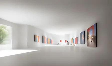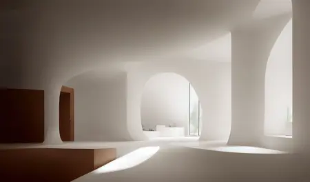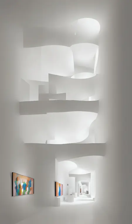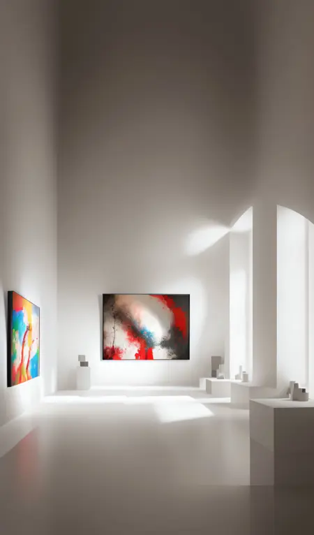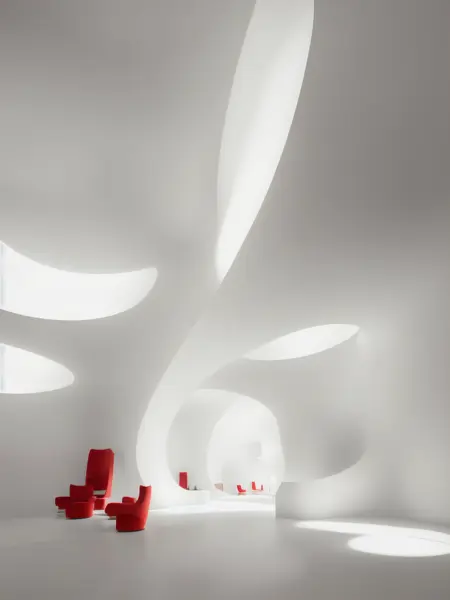 一个极简风格,光感立体,的室内LORA模型,偏向艺术空间,白色与红色效果再突出。