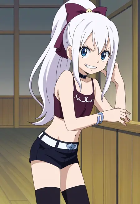 mj, 1girl, flat chest, blue eyes, long hair, white hair, ponytail, choker, collarbone, bare shoulders, tank top, crop top, short shorts, black shorts, black thighhighs, bracelet,