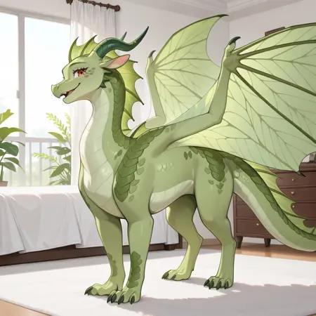 附加提示词:绿色鳞片、龙、角、爪子、鳞片、翅膀、叶形翅膀、尾巴、叶尖尾巴