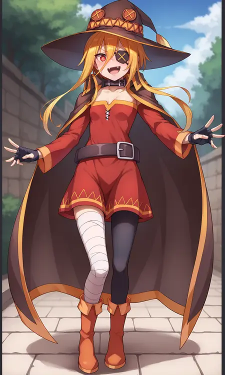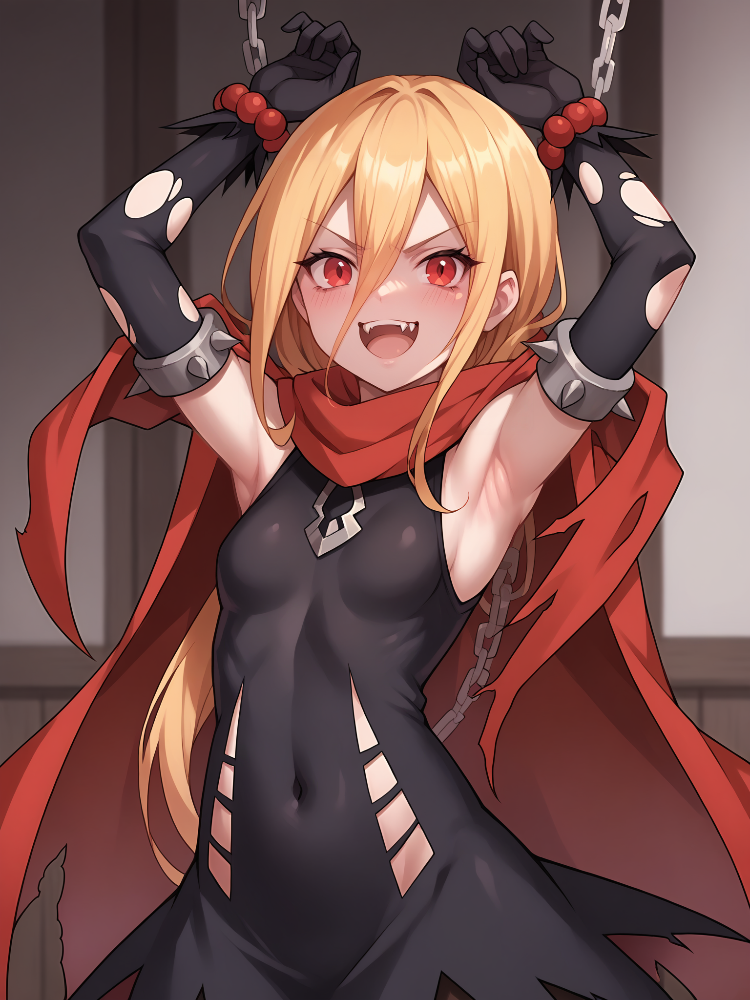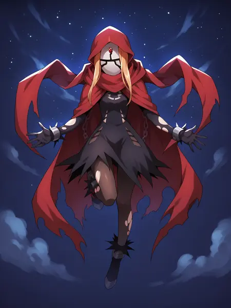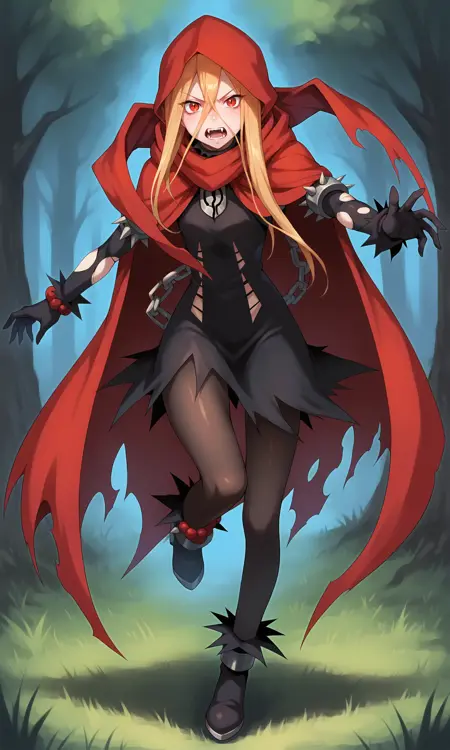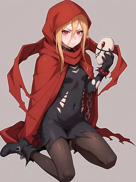 红色连衣裙装扮:black_short_dress_brown_pantyhose,Evileye,单人,red_cloak,torn_cloak,hooded_cloak,hood_up,torn_dress,torn_pantyhose,靴子,black_footwear,脚链,脚踝镣铐