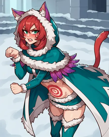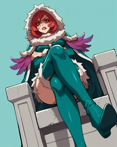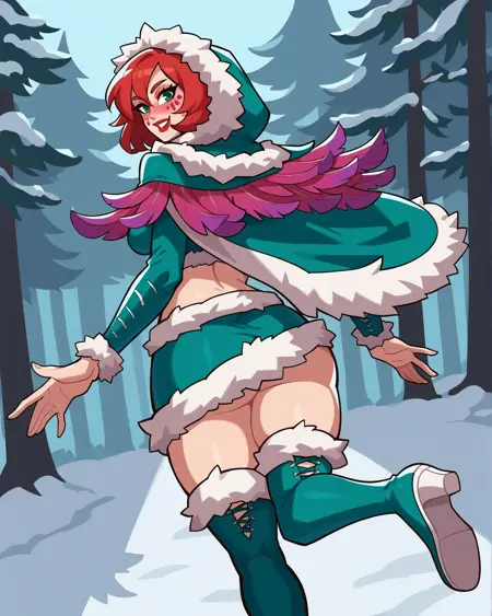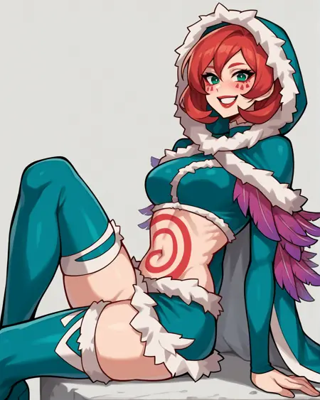 복장에는 "허리 부분, 배꼽, 후드 상단, 털장식, 아쿠아 커버렛, 털장식이 있는 커버렛, 후드가 있는 커버렛, 털장식이 있는 후드, 보라색 깃털, 아쿠아 자켓, 짧은 자켓, 털장식이 있는 자켓, 털장식이 있는 소매, 긴 소매, 아쿠아 사롱, 털장식이 있는 사롱, 아쿠아 신발, 털장식이 있는 부츠, 아쿠아 망토, 털장식이 있는 망토, 허벅지 부츠"를 사용하세요.