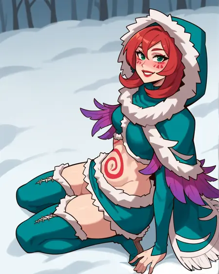 외모에는 "PolomaBR, 빨간 머리, 녹색 눈, 빨간 입술, 페이스페인트, 얼굴 무늬, 나선형, 복부 문신"을 사용하세요... 오호라...