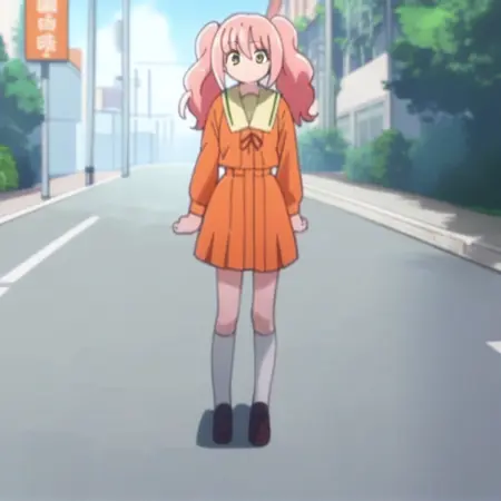 옷: 학교 유니폼, 노란색 세라후쿠, 치마, 흰 양말, 갈색 신발
