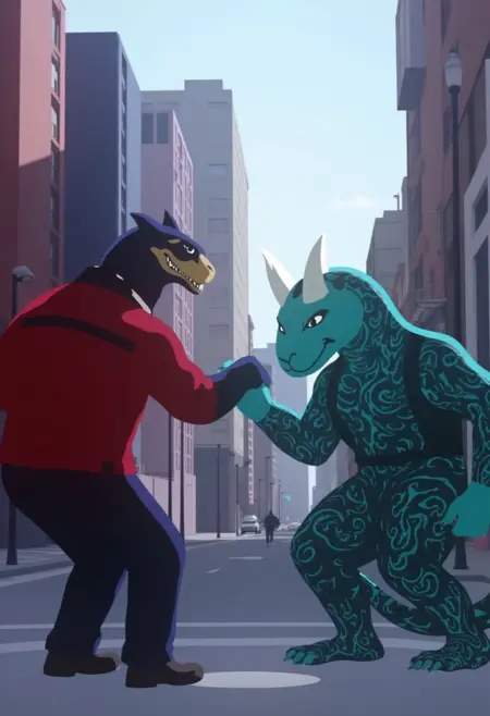 此 FLUX 风格源自 Caravan Palace 的 Lone Digger 音乐视频,这不仅是一首出色的歌曲,也是一部绝佳的音乐视频。它采用极简风格的卡通着色,并包含大量拟人化动物角色。